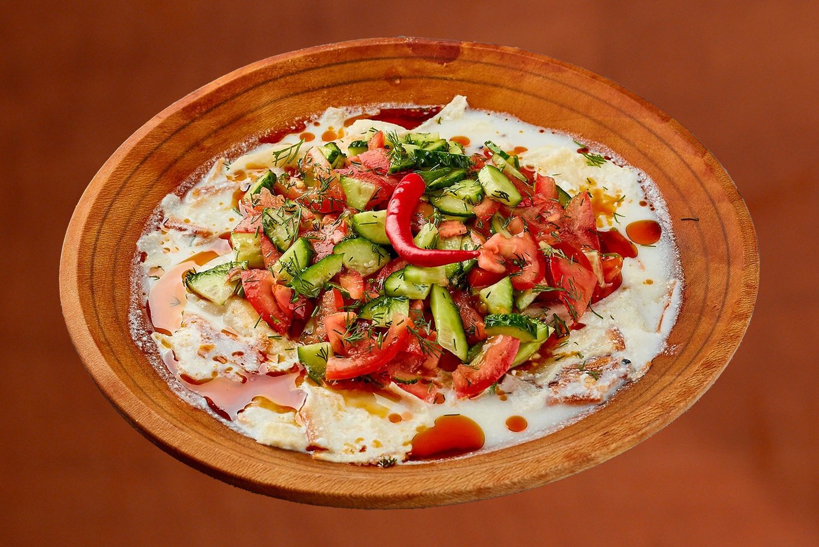traditional dish with bread, yogurt sauce, onion, and herbs